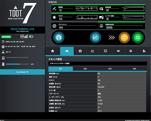 前述の通りTDOT 7 GREEN LITEは、Matrice300/350RTK(M300/350)にも搭載できるように軽量化したレーザースキャナではあるが、奇しくも本機のリリースと前後して、DJIがM300/350の後継機となるMatrice 400(M400)を発表したことで、ユーザーもM400に機材を移行していくのは自然な流れだろう。アミューズワンセルフではTDOT 7 GREEN LITEもM400への対応を行っており、この日はその開発過程をお披露目する形となった。