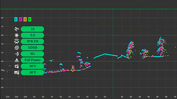 ソフトの画面上では、GNSSの衛星の受信状態や温度、アライメントの完了といったステータスを確認することが可能だ。また、M400のコントローラーの画面上では、今TDOT 7 GREEN LITEが計測している地形をリアルタイムで表示するため、飛行中、常に計測の出来高を確認することができる。
