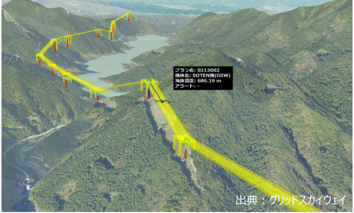 さらに2024年6月に政府が取りまとめた「デジタルライフライン全国総合整備計画」では、埼玉県秩父地域で、送電網に沿って150kmのドローン航路を設けるとされ、2025年3月には開通式が催された。このドローン航路は、2027年度を目途に関東・中国地方を中心に総延長約1万km、2027年度以降にはそのエリアを全国に広げ、総延長を約4万kmに伸ばすとしている。これを受け、グリッドスカイウェイなどを中心に、この航路を利用して送電網の点検を行うという。