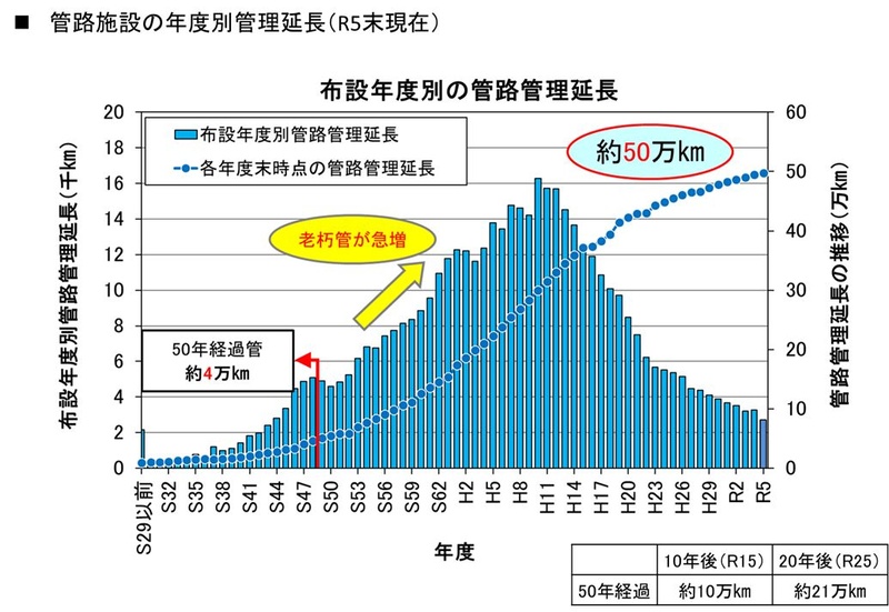 全国の下水道管路の総延長は2023年度末時点で約50万kmに上る。その多くが昭和40年代から平成10年代に集中的に整備されたこともあり、標準耐用年数の50年を経過した管路の総延長約4万km(総延長の約7%)が、10年後には約10万km(同約20%)、20年後には約21万km(同約42%)と今後急速に増加すると見込まれる。