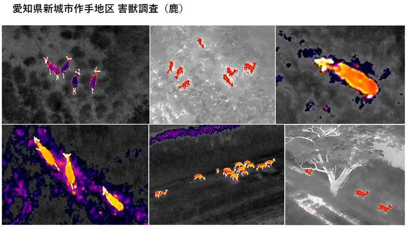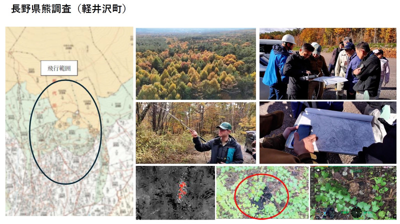 さらに同月、長野県軽井沢町では県の依頼により、今後の熊対策方針策定を見据えた実証実験を実施。ドローン測量と同様のグリッド飛行を応用して森林上空を往復し、赤外線カメラで面的にスキャンしたところ、森の中で2つの熱源を検知した。降下して確認するとひとつは熊の糞であったが、もう一方は実際に熊を捉えることに成功した。野生個体の位置把握にドローンが有効であることを示す結果となった。