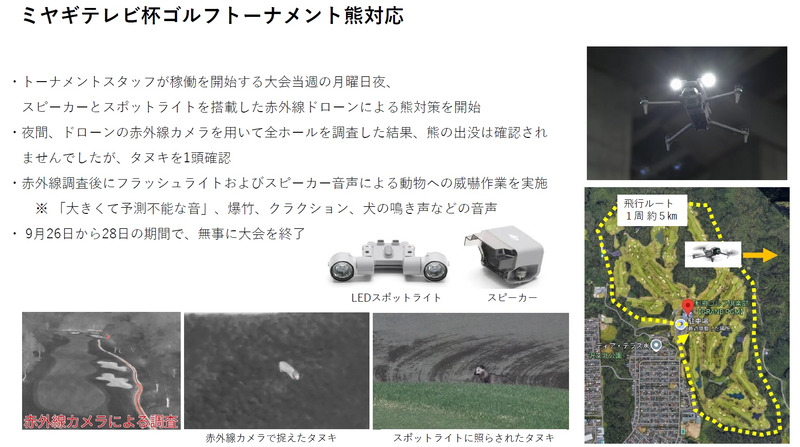宮城県・利府ゴルフ倶楽部の敷地は約130万m²。東京ドーム約27.6個分の広大な丘陵コースで、外周は約5kmに及ぶ。ドローンはまず境界線に沿って高度約30mで飛行し、赤外線カメラで熱源を探索。反応があれば高度20m程度まで降下し、可視光カメラで被写体を確認する運用を採った。期間中、一度だけ動物らしき熱源を検知したが、確認の結果タヌキと判明。熊の出没はなく、大会は無事に終了することができたという。熊対策に参加した猟友会関係者からは「これだけ広い場所で小動物を発見し、さらにはそれをタヌキであると把握できる技術はすごい」との評価もあったという。