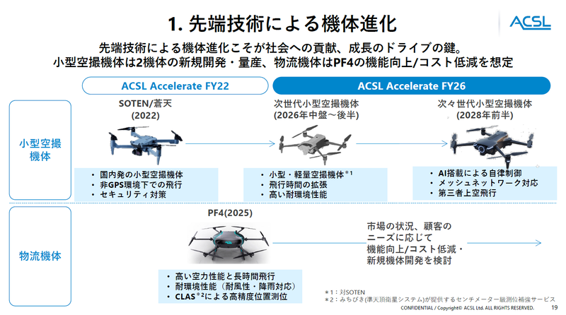 ACSLは現在、経済産業省のSBIRフェーズ3に採択された次世代小型空撮機の開発を進めている。最大の特徴はDJI Mavicクラス(約1kg)をベンチマークとした小型化であり、従来機SOTEN(約1.7kg)から大幅な携帯性・飛行時間の向上を図る。これにより、災害対応や監視用途における機動性を高め、現場実装を加速させる狙いだ。