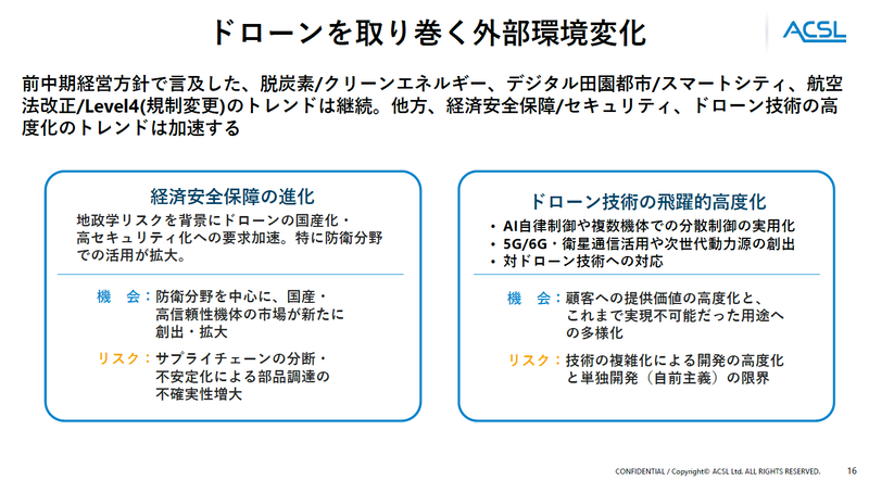 防衛分野では、他国での戦争においてドローンの有用性が立証されたこともあり、国内で急速に需要が立ち上がっている。3月には、防衛省向けとして受注金額約10億円の案件をACSLが受注した。寺山氏は「需要の立ち上がりが民生に比べて非常に早いのが特徴です。防衛分野の技術は、後に産業用ドローンの進化にもつながります」と言う。