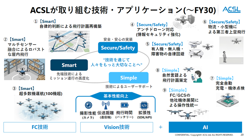 ACSLは中期経営方針「ACSL Accelerate FY26」において、以下の9つの重点技術を掲げている。これは単なる開発項目ではなく、同社が目指す技術的方向性を明確に示したものだ。