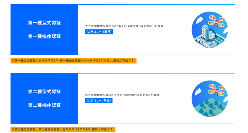 第一種型式認証、第一種機体認証:立入管理措置を講ずることなく行う特定飛行を目的とした機体/第二種型式認証、第二種機体認証:立入管理措置を講じた上で行う特定飛行を目的とした機体