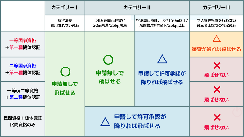 機体認証の取得は義務づけられておらず、任意での検査だ。国家資格である無人航空機操縦士を保有する使用者が機体認証を取得した機体でカテゴリーⅡ飛行(DID上空、夜間、目視外、人や物件から30m未満の飛行であり、飛行させる無人航空機の最大離陸重量が25kg未満)を行う場合、飛行許可承認申請を行わなくとも飛行できる。ただし、国家資格と機体認証いずれかが欠けている場合は飛行許可承認申請を免除される要件を満たさない。