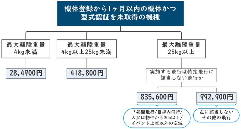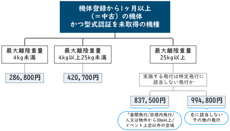 新品同様、中古であっても型式認証未取得の機種は手数料が高額になる。第二種機体認証の場合、型式認証を取得している中古機の手数料が8,200円から4万9,600円なのに対して、型式認証未取得の機体は以下のように28万6,800円から99万4,800円となっている。