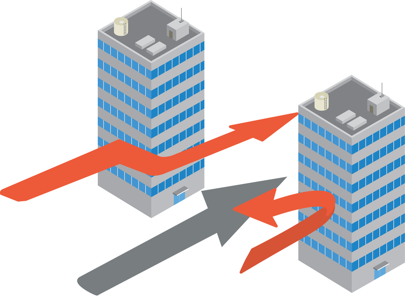 建物によって風の流れが収束することで、風速が増加する傾向がある。建物の間隔が狭いほど、また風速が速いほど強くなりやすい。