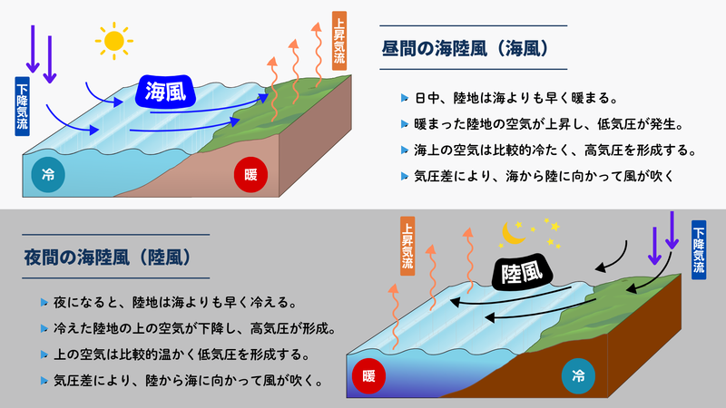 この風は海と陸の温度差によって生じる、気圧の変化が原因となって発生する。海陸風は、特に日差しの強い夏の沿岸部で顕著に見られる現象だ。