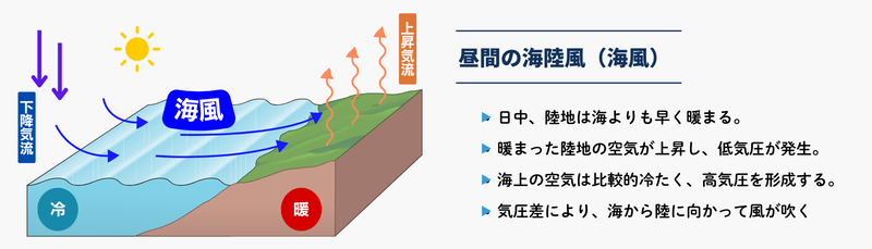 太陽光によって陸地が暖められると、陸地上の空気が膨張して上昇し、低圧部となる。一方、海上の空気は比較的冷たく、高圧部となる。この気圧差により、海から陸に向かって風(海風)が吹く。