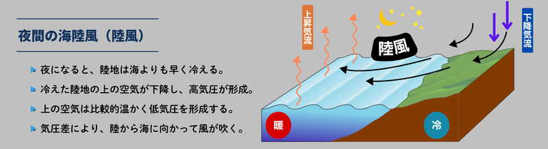 夜間の海陸風(陸風)は、陸から海に向かって吹く風である。これは、夜間に陸地が海よりも早く冷えることで発生する現象だ。