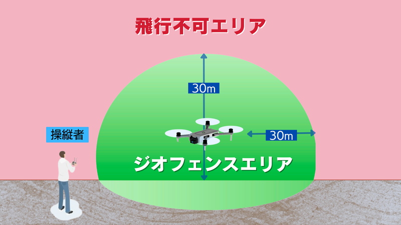 ジオフェンスは100%の安全を保証するものではなく、制御不能な状況ではドローンがジオフェンスの範囲外に飛び出す可能性がある。